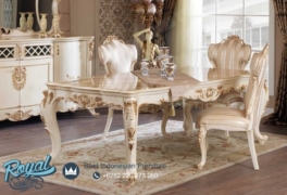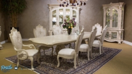 Model Meja Makan Mewah Bundar Rococo Gold – Merupakan desain meja makan bulat klasik terbaru dengan desain luxury classic dengan ukiran mebel jepara asli di lengkapi dengan meja makan 5 atau 6 kursi model klasik eropa yang sangat megah dan elegan sangat cocok untuk ruang meja makan mewah anda, produk furniture jepara terbaru ini kami menggunakan bahan Kayu Mahoni TPK Perhutani (Grade A) yang sudah kami seleksi kekuatan dan kekeringan pada bahan kayu tersebut sehingga kayu benar-benar layak untuk di produksi, di kerjakan dan di ukir langsung (Handmade) oleh pengrajin mebel jepara yang sudah piawai dan handal pada bidangnya sehingga memeberikan produk meja makan jepara terbaru dengan kualitas terbaik.