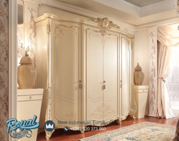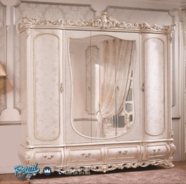 Almari Pakaian 4 Pintu Mewah Barnini Duco Klasik Terbaru – Produk furnitue Almari Pakaian di Finishing menggunakan Aplikasi Finishing Broken White Combi Gold Duco (NC) berkualitas halus sehingga akan nampak mewah dan warna tidak mudah pudar sehingga sangat berkualitas.