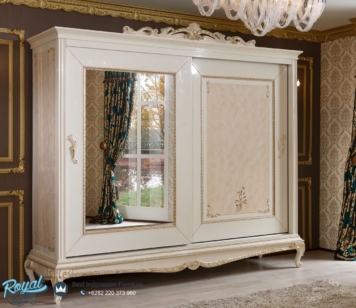 Almari Pakaian Mewah Jepara Klasik Terbaru – Produk furniture Almari Pakaian di Finishing menggunakan Aplikasi Finishing White combi Gold Duco (NC) berkualitas halus sehingga akan nampak mewah dan warna tidak mudah pudar sehingga sangat berkualitas.