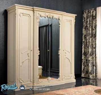 Almari Pakaian Mewah Klasik Eropa Model Pintu Kaca Model Terbaru – Produk furnitue Almari Pakaian di Finishing menggunakan Aplikasi Finishing Broken White Combi Gold Duco (NC) berkualitas halus sehingga akan nampak mewah dan warna tidak mudah pudar sehingga sangat berkualitas.