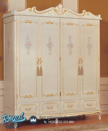 Almari Pakaian Mewah Klasik Jepara Terbaru – Produk furniture Almari Pakaian di Finishing menggunakan Aplikasi Finishing White combi Gold Duco (NC) berkualitas halus sehingga akan nampak mewah dan warna tidak mudah pudar sehingga sangat berkualitas.
