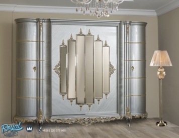 Almari Pakaian Model Denia Eropa Klasik Mewah Silver Duco Terbaru – Produk furniture Almari Pakaian di Finishing menggunakan Aplikasi Finishing Silver combi Gold Duco (NC) berkualitas halus sehingga akan nampak mewah dan warna tidak mudah pudar sehingga sangat berkualitas.