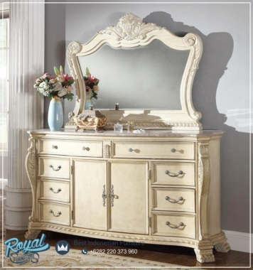 Model Meja Hias Klasik Ruang Tamu ini tak hanya di lengkapi 3 pintu dan 8 laci penyimpanan barang berharga anda, namun juga ada cermin ukiran mewah menambah kesan mewah pada meja wastafel ruan makan anda, dengan desain terbaru menambah kesan Mewah Modern untuk ruangan rumah mewah anda. Anda juga bisa custom pigura cermin ukiran sebagai produk pelengkap bufet credenza ini. Silahkan memesan langsung pada kami Royal Furniture jual meja console terbaru.