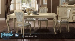 Dining Room Set Mewah Kassiopea Ukiran Terbaru – Untuk memberikan kesan mewah kami menggunakan aplikasi Finishing Broken White Duco (NC) dan joknya menggunakan Kain jok Bludru / Oscar Kulit Halus yang bermutu baik juga ditunjang dengan Busa LJ 26 yang akan terasa kenyal dan empuk saat anda mendudukinya, segera miliki set meja makan mewah ini untuk mempercantik tampilan ruang makan dalam rumah Anda.