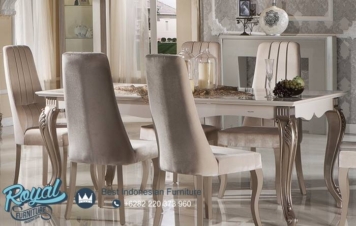 Dining Room Set Modern Mewah Odasi Model Terbaru – Untuk memberikan kesan mewah kami menggunakan aplikasi Finishing Broken White Duco (NC) dan joknya menggunakan Kain jok Bludru / Oscar Kulit Halus yang bermutu baik juga ditunjang dengan Busa LJ 26 yang akan terasa kenyal dan empuk saat anda mendudukinya, segera miliki set meja makan mewah ini untuk mempercantik tampilan ruang makan dalam rumah Anda.