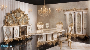Model Meja Makan Set 8 Kursi – Untuk memberikan kesan mewah kami menggunakan aplikasi Finishing Duco Classic Gold (NC / PU) dan di balut dengan kain menggunakan Kain Jok Motif Turki yang bermutu baik juga ditunjang dengan Busa LJ 26 yang akan terasa kenyal dan empuk saat anda mendudukinya, segera miliki 6 kursi dengan meja makan ukiran mewah ini untuk mempercantik tampilan ruang makan dalam rumah Anda.