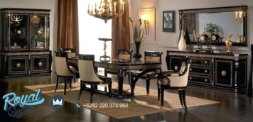 Furniture Design Luxury Style Dining Room Sets Classic Terbaru – Untuk memberikan kesan mewah kami menggunakan aplikasi Finishing Black combi Gold Duco (NC) dan joknya menggunakan Kain jok Bludru / Oscar Kulit Halus yang bermutu baik juga ditunjang dengan Busa LJ 26 yang akan terasa kenyal dan empuk saat anda mendudukinya, segera miliki set meja makan mewah ini untuk mempercantik tampilan ruang makan dalam rumah Anda.