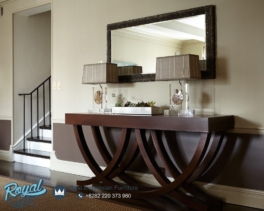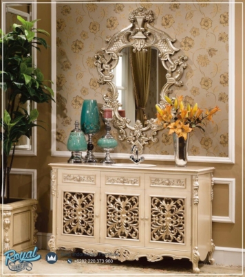 Model Console Table Kabinet Wastafel Jepara ini tak hanya di lengkapi 3 pintu dan 3 laci penyimpanan barang berharga anda, namun juga ada cermin ukiran mewah menambah kesan mewah pada meja wastafel ruan makan anda, dengan desain terbaru menambah kesan Mewah Modern untuk ruangan rumah mewah anda. Anda juga bisa custom cermin hias sebagai produk pelengkap bufet credenza ini. Silahkan memesan langsung pada kami Royal Furniture jual meja konsol cermin hias.