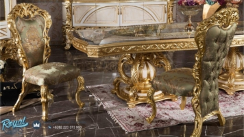 Model Meja Makan Mewah Set 8 Kursi – Untuk memberikan kesan mewah kami menggunakan aplikasi Finishing Duco Classic Gold (NC / PU) dan di balut dengan kain menggunakan Kain Jok Motif Turki yang bermutu baik juga ditunjang dengan Busa LJ 26 yang akan terasa kenyal dan empuk saat anda mendudukinya, segera miliki 6 kursi dengan meja makan ukiran mewah ini untuk mempercantik tampilan ruang makan dalam rumah Anda.