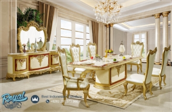 Meja makan luxury ini agar terkesan klasik, kami menggunakan aplikasi Finishing White Classic Combine Gold (Duco), dan di balut dengan kain menggunakan Kain Leather (Sesuai Permintaan). Dan juga ditunjang dengan Busa Royal Foam LJ 26, yang akan terasa kenyal dan empuk saat anda mendudukinya. Segera miliki meja makan jepara mewah ini untuk mempercantik tampilan furniture ruang makan dalam rumah Anda.