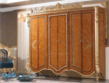 Desain almari wardrobe ini berkategori furniture luxury yang cocok dijadikan penyimpanan baju istimewa Anda. Dan juga lemari ruang pakaian ini di finishing menggunakan Aplikasi Finishing Classic Natural kombinasi Gold (NC) berkualitas halus sehingga akan nampak mewah dan warna tidak mudah pudar sehingga sangat berkualitas pada kabinet lemari kayu ukiran mewah 6 pintu.