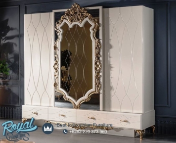Lemari Pakaian Mewah Mirror Roma Yatak Luxury Model Terbaru – Produk furniture Almari Pakaian di Finishing menggunakan Aplikasi Finishing White combi Gold Duco (NC) berkualitas halus sehingga akan nampak mewah dan warna tidak mudah pudar sehingga sangat berkualitas.