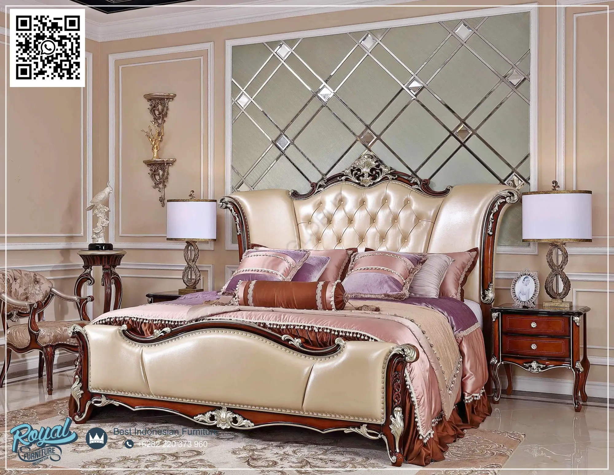 CV. Royal Furniture Jepara membuatan dengan material berkualitas tinggi pada furniture set tempat tidur mewah gaya racoco ini dibuat dari kayu jati / mahoni pilihan yang telah melalui proses pengeringan dan pengawetan, menjadikannya kokoh dan tahan lama. Kualitas pengerjaan oleh pengrajin Jepara yang berpengalaman memastikan setiap detail ukiran terlihat presisi dan artistik. Satu Set tempat tidur ukiran ini cocok untuk Master bedroom rumah mewah, Villa & hotel berbintang, Pasangan baru atau kolektor furniture modern klasik.