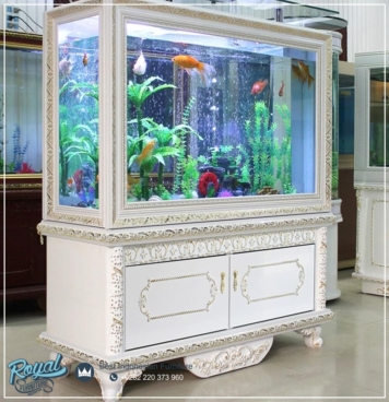 Desain Meja Aquarium Ikan Hias Koi – cabinet aquarium mewah ini dihiasi dengan motif ukiran klasik mebel jepara yang akan menambah kesan mewah dan elegan pada produk lemari aquarium ini. lemari aquarium ikan hias ini kami finishing menggunakan warna Duco Putih Kombi Goldlef (NC) Produk ini banyak di minati karena memiliki kualitas yang baik dan kontruksi yang sangat kuat karena di tangani oleh pengrajin mebel jepara yg sudah handal, jika anda mencari produk lemari aquarium yang berkualitas, produk royal furniture jepara ini merupakan pilihan yang tepat bagi anda.