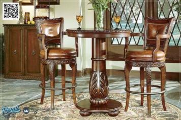 Furniture meja bar cafe mewah yang dirancang dengan gaya elegan dan timeless set kursi bar mewah cafe jakarta, sering terbuat dari kayu berkualitas seperti jati dan mahoni dengan ukiran detail, finishing klasik glossy mewah, atau sentuhan luxury. Desainnya biasanya menampilkan elemen dekoratif seperti kaki meja yang kokoh, aksen logam, serta lemari rak penyimpanan untuk botol serta gelas.