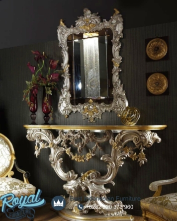 Meja Console Luxury Classic Silver Gold – Merupakan produk furniture custom design meja konsul dan cermin ukir mewah terbaru mebel jepara yang kami tawarkan kepada anda dengan desain ukiran khas mebel jepara model produk mewah untuk ruangan dalam rumah yang cocok untuk meja hias ruang tamu rumah anda, dengan meja konsul klasik terbaru ini akan sangat menunjang kemewahan ruangan dalam rumah anda dan pastinya akan memberikan prestise yang tinggi bagi pemiliknya, karena bukan hanya sebagai koleksi mebel rumah tapi juga mengandung nilai seni yang tinggi didalamnya.