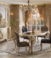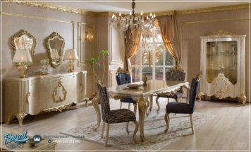 Desain meja makan klasik yang di beri sentuhahan warna finishing Champagne Kombinasi Gold Antique (Duco), menonjolkan kesan mewah dan eksklusif. Motif emas terlihat pada setiap ukiran khas mebel jepara menjadikan setiap seni ukir yang ada di meja ruang makan mewah ini terlihat sangat cantik, selain itu juga di tambahkan Busa Royal Foam (LJ26) Empuk & kenyal dengan di balut Kain Oscar Leather (Impor) menambah keistimewaan pada produk ini.