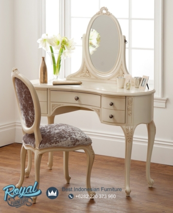Meja Rias Mewah Model Ivory White Terbaru – Model Meja Ukiran Jepara untuk berhias mempunyai nilai seni ukir yang tinggi, di buat oleh Pengrajin Mebel Jepara yang sudah handal selain itu kami juga menggunakan Bahan Material Kayu Mahoni Perhutani grade A Pilihan dengan kualitas kayu yang sudah kami pilih untuk pembuatan Meja Rias Jepara Terbaru ini. Sangat cocok untuk meja rias anda dan di tambah laci untuk menyimpan kosmetik atau barang perlenglapan lainnya. Meja rias ini juga dilengkapi dengan puff atau dudukan sebagai set produknya.
