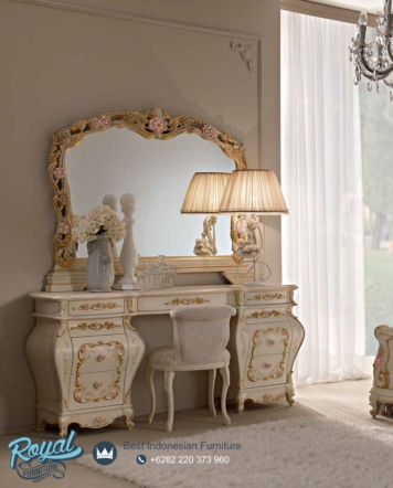 Meja Rias Mewah Spalnya Venesia Furniture Klasik Mewah Terbaru– Meja Rias ini juga di Finishing dengan Cat White combi Gold Duco (NC Doff/Glossy) yang sangat halus dan warna tahan lama sehingga menambah kualitas pada produk meja rias jepara terbaru ini.