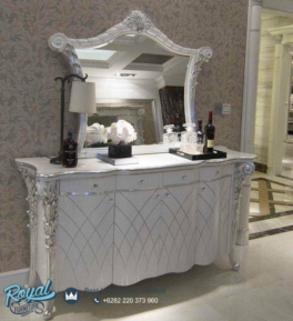 Meja Rias Mewah Victorian Klasik Italian Baroque Terbaru– Ini juga di Finishing dengan Cat Broken White Duco (NC Doff/Glossy) yang sangat halus dan warna tahan lama sehingga menambah kualitas pada produk meja rias jepara terbaru ini.