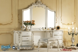 Meja Rias Terbaru Ukir Jepara ini adalah produk furniture custom design meja untuk berias di kamar Anda yang bernuansa mewah jepara ini termasuk model furniture klasik ukiran yang mempunyai nilai seni ukir yang tinggi, di buat oleh pengrajin mebel jepara yang sudah handal. Selain itu kami juga menggunakan Bahan Material Kayu Jati / Mahoni Perhutani (Grade A) Pilihan dengan kualitas kayu yang sudah kami pilih untuk pembuatan produk desain meja rias jepara ini sangat cocok untuk meja berias Anda. dan di tambah laci untuk menyimpan kosmetik atau barang perlenglapan lainnya agar terlihat rapih. Tolet atau meja rias mewah ini juga dilengkapi dengan puff atau dudukan sebagai satu paket produknya.