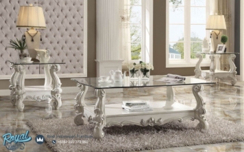 Meja Tamu Coffe Table Modern Putih Ukiran Jepara Versailles – Merupakan desain model meja tamu modern ukir top kaca terbaru jepara kualitas terbaik yang dibuat hampir disetiap sisi produk ini dengan tingkat ketelitian yang tinggi dalam mendesain dan membuat konstruksi yang kuat karena dibuat dengan menggunakan Bahan/Material Kayu Mahoni TPK Perhutani (Grade A) dengan tingkat kekeringan dan umur kayu yang sudah layak dengan keindahan yang dibuat oleh tukang asli jepara yang sudah piawai dan berpengalaman dibidangnya untuk memberi kesan mewah dan elegan sehingga model meja ruang tamu jepara terbaru ini sangat cocok untuk Anda miliki di ruang tamu.