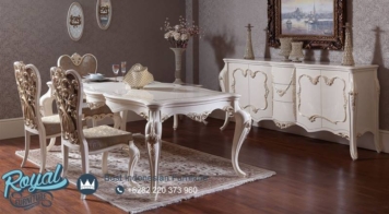Model Kursi Meja Makan Mewah Style Terbaru – Untuk memberikan kesan mewah kami menggunakan aplikasi Finishing White Duco (NC) dan joknya menggunakan Kain jok Bludru / Oscar Kulit Halus yang bermutu baik juga ditunjang dengan Busa LJ 26 yang akan terasa kenyal dan empuk saat anda mendudukinya, segera miliki set meja makan mewah ini untuk mempercantik tampilan ruang makan dalam rumah Anda.