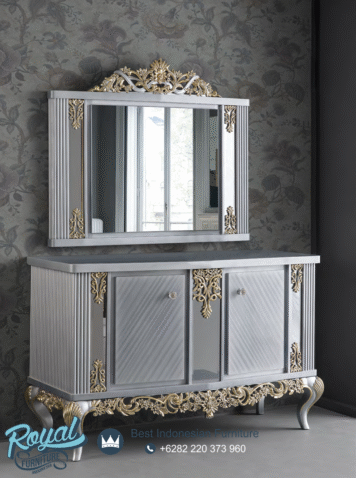 Model Meja Konsol Klasik Eropa Terbaru dengan Laci Harga Murah – ini di lengkapi cermin ukir mewah menambah kesan mewah pada meja console ruangan anda, dengan desain terbaru menambah kesan Mewah Modern untuk ruangan rumah mewah anda. Anda juga bisa menambahkan cermin sebagai produk pelengkap meja console ini juga dengan memesan langsung pada kami.