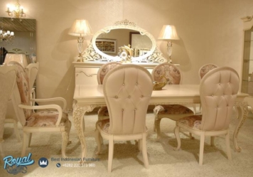 Model Set Furniture Ruang Makan Mewah Terbaru – Untuk memberikan kesan mewah kami menggunakan aplikasi Finishing Broken White Duco (NC) dan joknya menggunakan Kain jok Bludru / Oscar Kulit Halus yang bermutu baik juga ditunjang dengan Busa LJ 26 yang akan terasa kenyal dan empuk saat anda mendudukinya, segera miliki set meja makan mewah ini untuk mempercantik tampilan ruang makan dalam rumah Anda.
