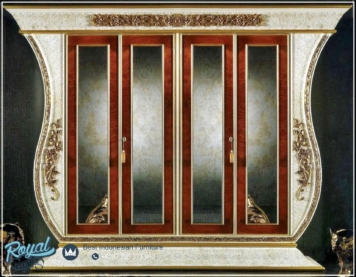 Almari Pakaian Mewah Terbaru 4 Pintu Kaca – Produk furniture Almari Pakaian di Finishing menggunakan Aplikasi Finishing Classic Duco combi Goldleaf (NC) berkualitas halus sehingga akan nampak mewah dan warna tidak mudah pudar sehingga sangat berkualitas.