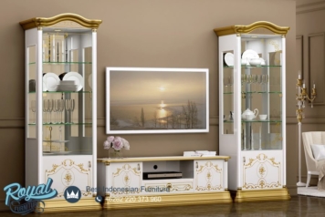 Set Bufet TV Almari Hias Modern Mewah Design Terbaru –  dihiasi dengan motif ukiran klasik mebel jepara yang akan menambah kesan mewah dan elegan pada produk bufet tv mewah ini. Bufet TV mewah ini di Finishing menggunakan warna White combi Gold Duco (NC). Produk ini banyak di minati karena memiliki kualitas yang baik, jika anda mencari produk meja tv yang berkualitas, produk Furniture Jepara ini merupakan pilihan yang tepat bagi anda.