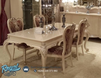 Set Furniture Ruang Makan Model Klasik Mewah Terbaru – Untuk memberikan kesan mewah kami menggunakan aplikasi Finishing Broken White Duco (NC) dan joknya menggunakan Kain jok Bludru / Oscar Kulit Halus yang bermutu baik juga ditunjang dengan Busa LJ 26 yang akan terasa kenyal dan empuk saat anda mendudukinya, segera miliki set meja makan mewah ini untuk mempercantik tampilan ruang makan dalam rumah Anda.