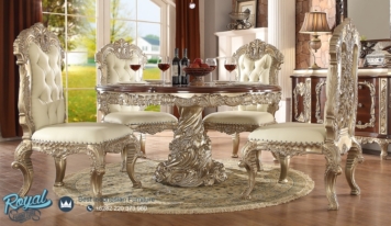 Set Kursi Meja Makan Low Seat Ukiran Mewah Terbaru – Untuk memberikan kesan mewah kami menggunakan aplikasi Finishing Silver Duco (NC) dan joknya menggunakan Kain jok Bludru / Oscar Kulit Halus yang bermutu baik juga ditunjang dengan Busa LJ 26 yang akan terasa kenyal dan empuk saat anda mendudukinya, segera miliki set meja makan mewah ini untuk mempercantik tampilan ruang makan dalam rumah Anda.