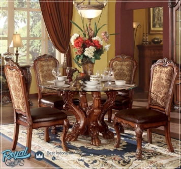 Meja Makan Bulat Mewah Jepara – Adalah desain meja makan klasik terbaru dengan desain antik dengan ukiran mebel jepara asli di lengkapi dengan meja makan bulat 4 kursi model ukir klasik yang sangat megah dan elegan sangat cocok untuk ruang makan mewah anda, produk furniture jepara terbaru ini kami menggunakan bahan Kayu Jati TPK Perhutani (Grade A) yang sudah kami seleksi kekuatan dan kekeringan pada bahan kayu tersebut sehingga kayu benar-benar layak untuk di produksi, di kerjakan dan di ukir langsung (Handmade) oleh pengrajin mebel jepara yang sudah piawai dan handal pada bidangnya sehingga memeberikan produk meja makan jati terbaru dengan kualitas terbaik.