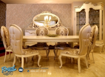 Set Meja Makan Klasik Oval Furniture Set Dining Room Mewah Terbaru – Untuk memberikan kesan mewah kami menggunakan aplikasi Finishing Broken White Duco (NC) dan joknya menggunakan Kain jok Bludru / Oscar Kulit Halus yang bermutu baik juga ditunjang dengan Busa LJ 26 yang akan terasa kenyal dan empuk saat anda mendudukinya, segera miliki set meja makan mewah ini untuk mempercantik tampilan ruang makan dalam rumah Anda.