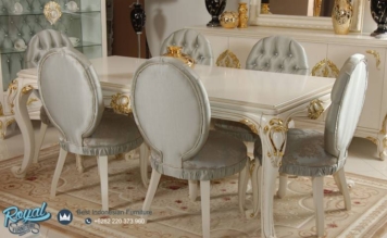 Set Meja Makan Mewah Alize New Design Terbaru – Untuk memberikan kesan mewah kami menggunakan aplikasi Finishing White Duco  (NC) dan joknya menggunakan Kain jok Bludru / Oscar Kulit Halus yang bermutu baik juga ditunjang dengan Busa LJ 26 yang akan terasa kenyal dan empuk saat anda mendudukinya, segera miliki set meja makan mewah ini untuk mempercantik tampilan ruang makan dalam rumah Anda.