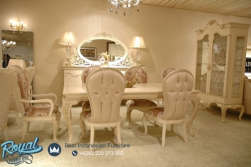 Set Meja Makan Mewah Hisar Odasi Duco Terbaru – Untuk memberikan kesan mewah kami menggunakan aplikasi Finishing Broken White Duco (NC) dan joknya menggunakan Kain jok Bludru / Oscar Kulit Halus yang bermutu baik juga ditunjang dengan Busa LJ 26 yang akan terasa kenyal dan empuk saat anda mendudukinya, segera miliki set meja makan mewah ini untuk mempercantik tampilan ruang makan dalam rumah Anda.