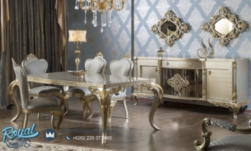 Set Meja Makan Mewah Istanbul Style Mewah Terbaru – Untuk memberikan kesan mewah kami menggunakan aplikasi Finishing Gold Duco (NC) dan joknya menggunakan Kain jok Bludru / Oscar Kulit Halus yang bermutu baik juga ditunjang dengan Busa LJ 26 yang akan terasa kenyal dan empuk saat anda mendudukinya, segera miliki set meja makan mewah ini untuk mempercantik tampilan ruang makan dalam rumah Anda.