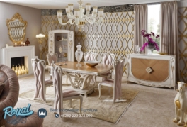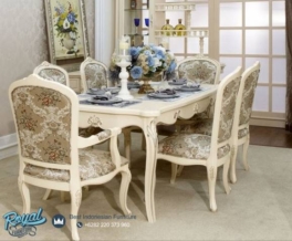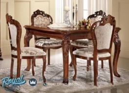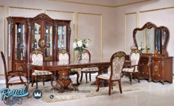 Set Meja Makan Mewah Kayu Jati Terbaru Domenica – Untuk memberikan kesan mewah kami menggunakan aplikasi Finishing Natural Jati Combi Gold (Duco) dan di balut dengan kain menggunakan Bludru Motif (Sesuai Permintaan) yang bermutu baik juga ditunjang dengan Busa Royal Foam LJ 26 kualitas terbaik yang akan terasa kenyal dan empuk saat anda mendudukinya, segera miliki model meja makan jepara terbaru ini untuk mempercantik tampilan ruang makan dalam rumah mewah anda dan dapatkan harga dan kualitas terbaik dari royal furniture jepara.