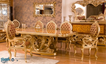 Set Meja Makan Mewah Indestian Model Furniture Dining Room – Untuk memberikan kesan mewah kami menggunakan aplikasi Finishing Gold Duco (NC) dan joknya menggunakan Kain jok Bludru / Oscar Kulit Halus yang bermutu baik juga ditunjang dengan Busa LJ 26 yang akan terasa kenyal dan empuk saat anda mendudukinya, segera miliki set meja makan mewah ini untuk mempercantik tampilan ruang makan dalam rumah Anda.