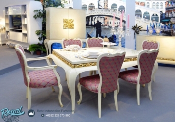 Set Meja Makan Mewah Modern Ukir Jepara Classy Terbaru – Untuk memberikan kesan mewah kami menggunakan aplikasi Finishing White combi Gold Duco (NC) dan joknya menggunakan Kain jok Bludru / Oscar Kulit Halus yang bermutu baik juga ditunjang dengan Busa LJ 26 yang akan terasa kenyal dan empuk saat anda mendudukinya, segera miliki set meja makan mewah ini untuk mempercantik tampilan ruang makan dalam rumah Anda.
