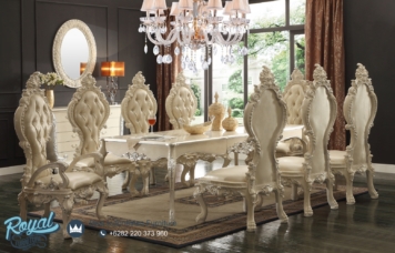 Set Meja Makan Mewah Waru Ukiran Jepara Terbaru – Untuk memberikan kesan mewah kami menggunakan aplikasi Finishing White Duco (NC) dan joknya menggunakan Kain jok Bludru / Oscar Kulit Halus yang bermutu baik juga ditunjang dengan Busa LJ 26 yang akan terasa kenyal dan empuk saat anda mendudukinya, segera miliki set meja makan mewah ini untuk mempercantik tampilan ruang makan dalam rumah Anda.