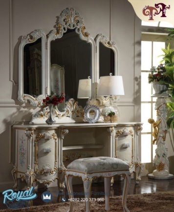Set Meja Rias Mewah Classical Furniture For Home Palace Royal Furniture– Ini juga di Finishing dengan Cat White Combi Gold Duco (NC Doff/Glossy) yang sangat halus dan warna tahan lama sehingga menambah kualitas pada produk meja rias jepara terbaru ini.
