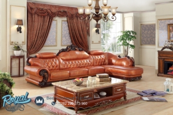 Sofa Tamu Mewah Leter L Sudut Leather Wooden Frame Ukiran Jepara Terbaru